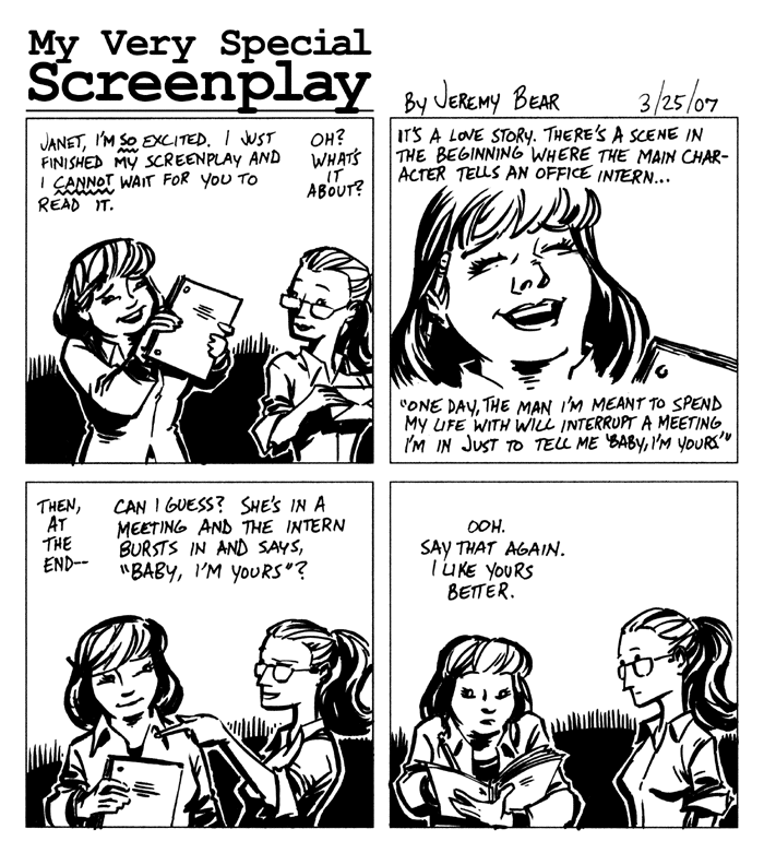 I've made a habit of drawing short, one-page comics for important people in my life. This is a catalog of the ones I've done so far. Click the images to enlarge.