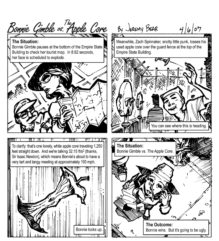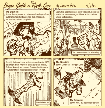 I knew it when I saw Zach in the elevator with an apple...I knew that core would be going over the fence. I just knew it.And that smarmy look on his face as he tosses it. Punk!